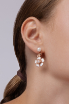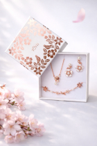 The Blooming May and Doves set in rose gold finish with white shell pearls consists of smaller Dove and cherry earrings, a Caring Dove chain necklace, and a Blooming May chain bracelet.