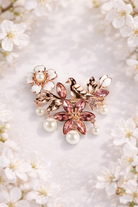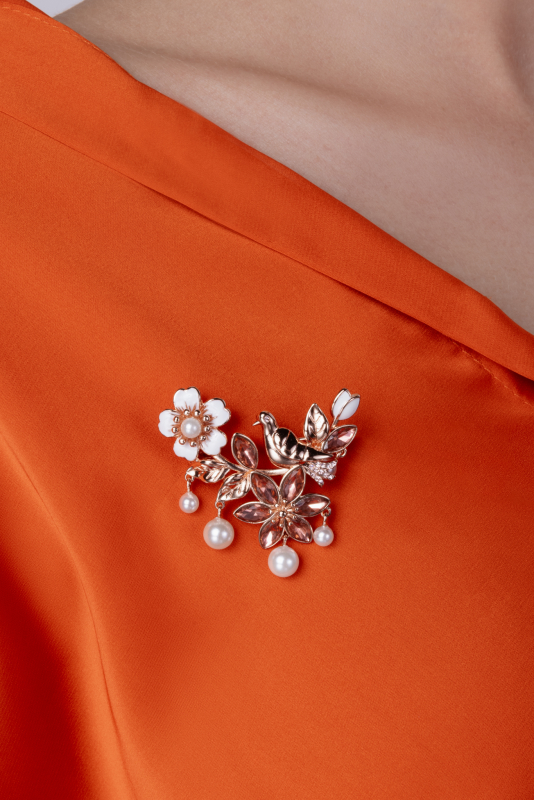 The rose-gold Caring Dove brooch, featuring motifs of flowers from blossoming May trees and a caring dove with white shell pearls, will be an elegant finishing touch to any outfit.