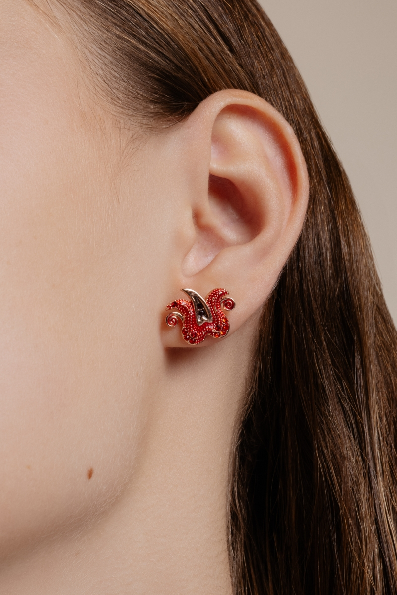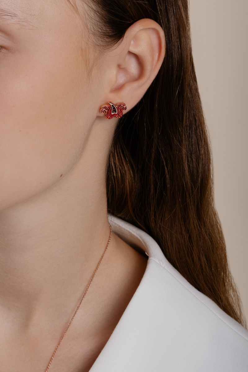 Popular folk motif of the tulip flower, this time in a beautiful deep red color complemented with rosegold plating. Perfect size for everyday wear.
