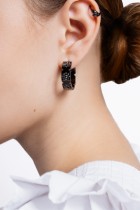 Medium-sized hoop earrings with patterns of tiny crystal flowers around the entire circumference of each earring. Simple and sophisticated design suitable for any occasion. In the modern, elegant design of the Roots of Pop Art jewelry #1921, the inspiration of bead embroidery from the bonnet from the folk costume of Miková and art nouveau is perfectly mixed.