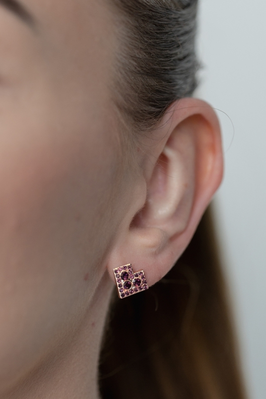 Rosegold earrings with a heart ornament - a symbol of love in a traditional Čičman design, decorated with small purple crystals. The jewelry is suitable for all occasions and can be worn by women of all ages. When creating jewelry of the FOLKIE Čičmany collection, we took inspiration from the original Čičman folk costume and geometric patterns on the iconic Čičman houses.