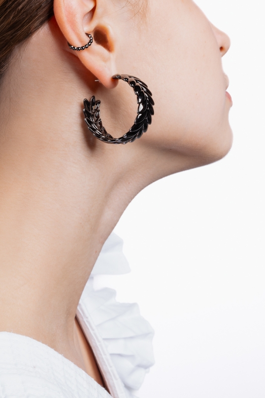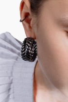 Distinctive hoop earrings with a wheat ear pattern all around their circumference. In the modern, elegant design of the Roots of Pop Art jewelry #1921, the inspiration of bead embroidery from the bonnet from the folk costume of Miková and art nouveau is perfectly mixed.
