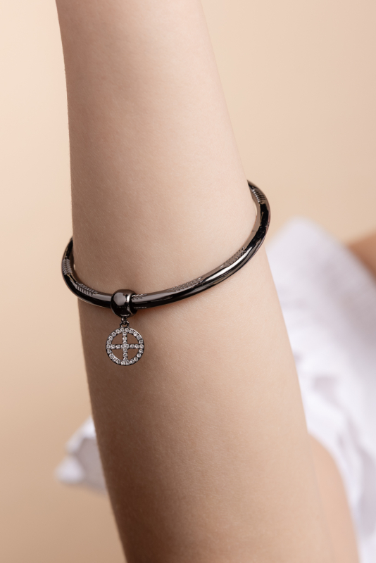 The Eternity pendant with a gunmetal finish and white crystals symbolizes eternity, the endless cycle of life, and balance in the world.