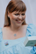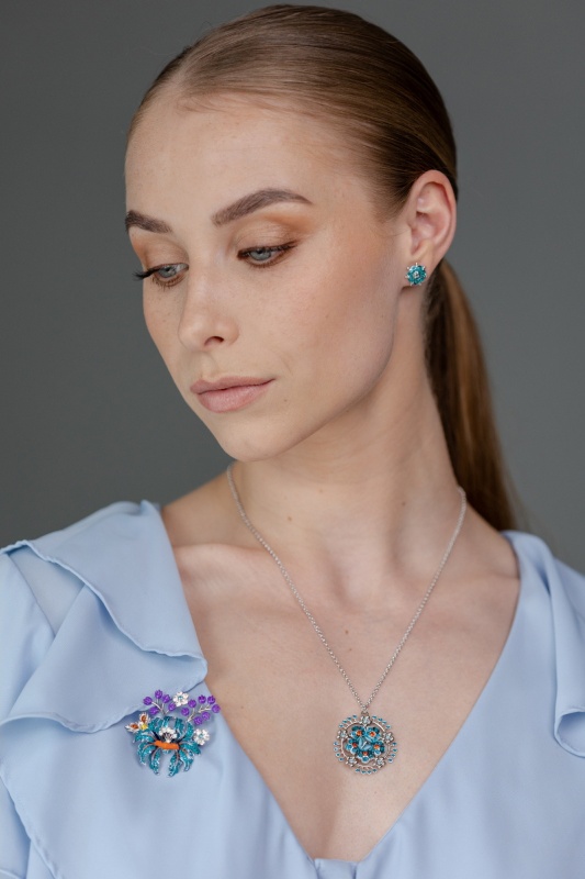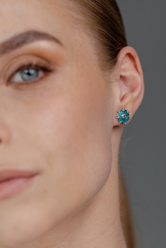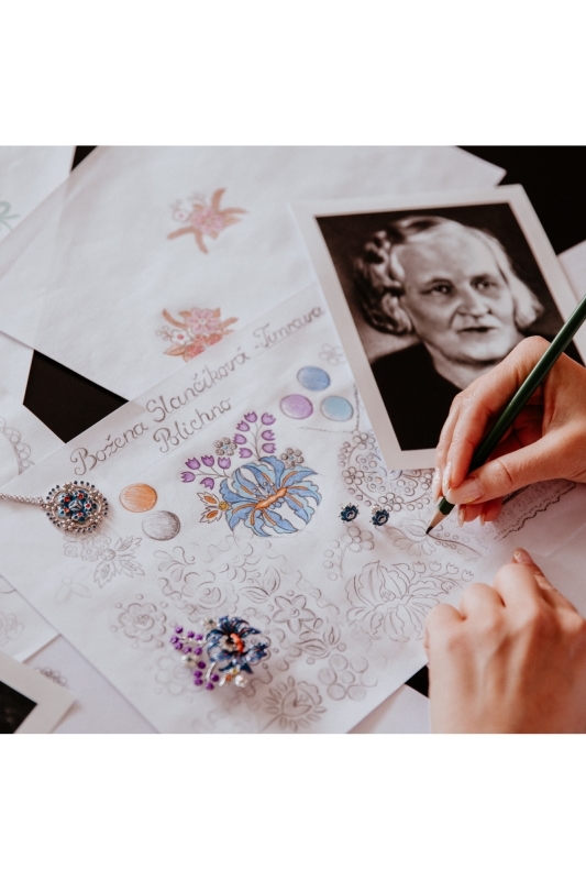 Blue flower earrings in combination with silver metal dedicated to the Slovak writer Božena Slančíková-Timrava and inspired by a flower embroidered on a bodice, which is part of the folk costume in her native village Polichno. The collection was created out of respect for leading Slovak female writers and inspired by the eternity of works of art they have written and from which generations draw to this day. May also these unfading flowers recall their infinite greatness and eternity.