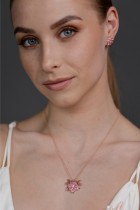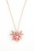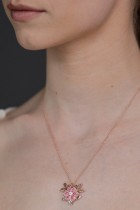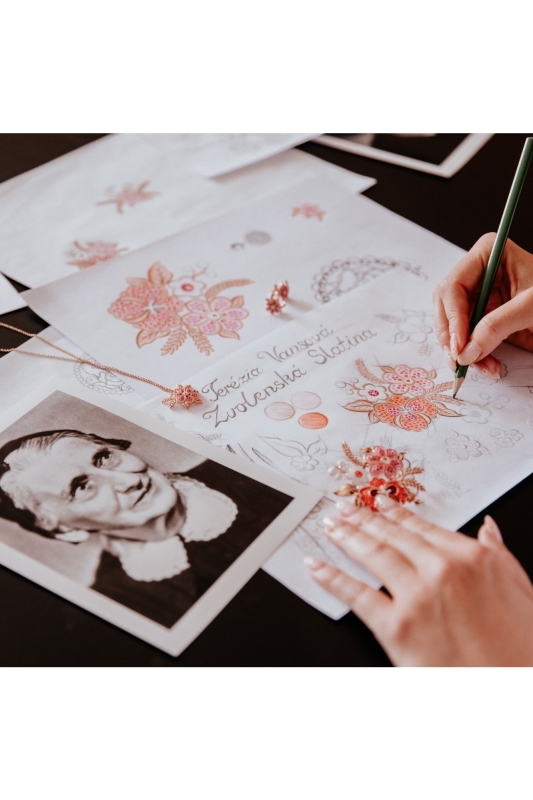 Pendant with a chain with a pink flower painted with a jewellery enamel dedicated to the Slovak writer Terezia Vansová and inspired by embroidered flowers on a skirt from her native village Zvolenská Slatina. The collection was created out of respect for leading Slovak female writers and inspired by the eternity of works of art they have written and from which generations draw to this day. May also these unfading flowers recall their infinite greatness and eternity.