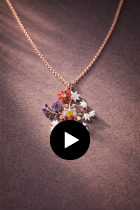 A flower pendant on a pink-gold chain with bouquets of pasqueflowers and lilies of the valley in beautiful colors, symbolizing the beautiful season - red-orange, pale violet, and pure white. Breathe in the spring with our Lily jewelry series inspired by the folk costume from the village of Terchová.