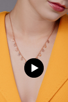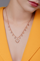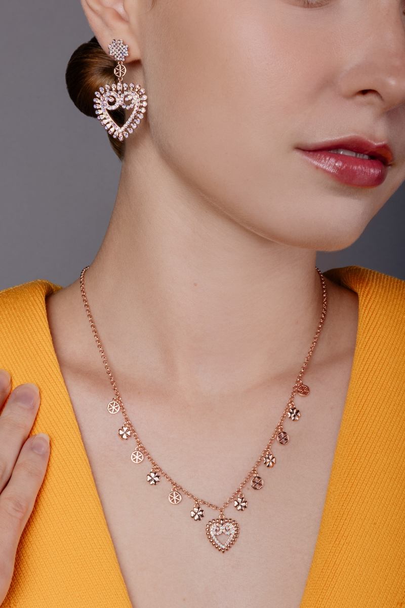 A necklace with a larger heart, adorned with tiny mother-of-pearl crystals that beautifully play with colors in the light. It is complemented by delicate rose-gold charms in the shape of four-leaf clovers and periwinkle flowers.