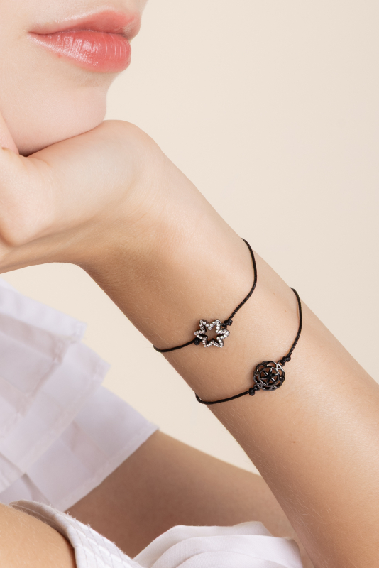 A cord bracelet with a Protective Perunica pendant in a gunmetal finish. It symbolizes the power of life, protection, and balance.