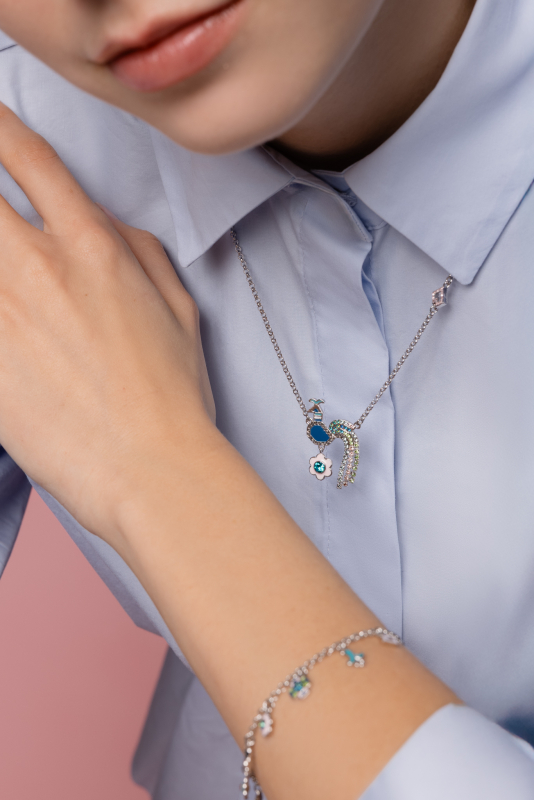 A delicate Rooster chain necklace made of rhodium-plated brass, complemented with enamel and Czech crystal.