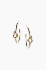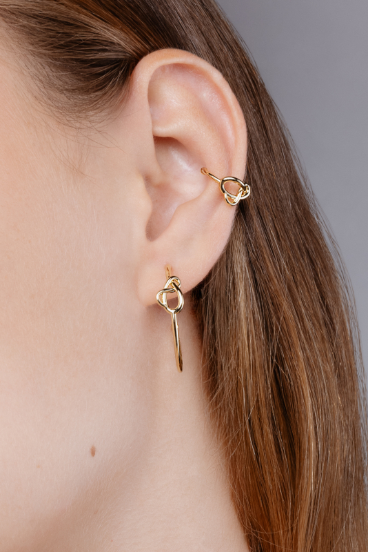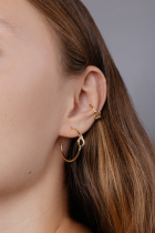 Small gold-colored hoop earrings with Petra Toth logo detail. Elegant stud earrings that add a subtle yet distinctive accent to everyday style. The Petra Toth 18 series was created to celebrate the 18th anniversary of the brand and carries the symbolism of honoring its journey so far.