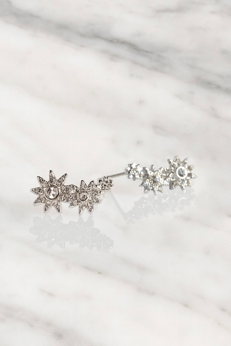 Rhodium-plated earrings with a two-star motif, inspired by Empress Sisi and her longing for freedom. A pair of radiant stars symbolizes balance, feminine strength, and a gentle light that accompanies every step.