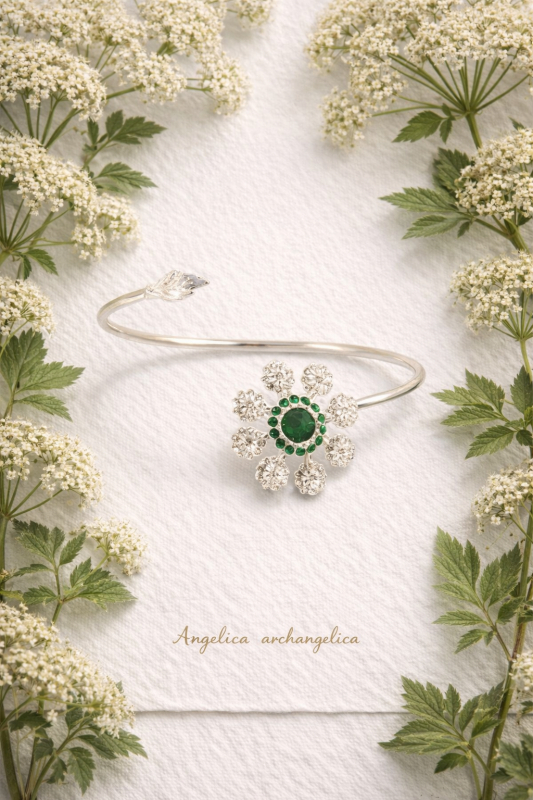 A thin bracelet with the Angelica archangelica flower, which symbolizes protection and harmony. Delicate jewels in emerald green, surrounded by tiny crystals that evoke drops of morning dew.