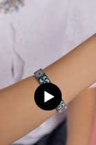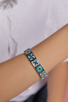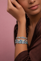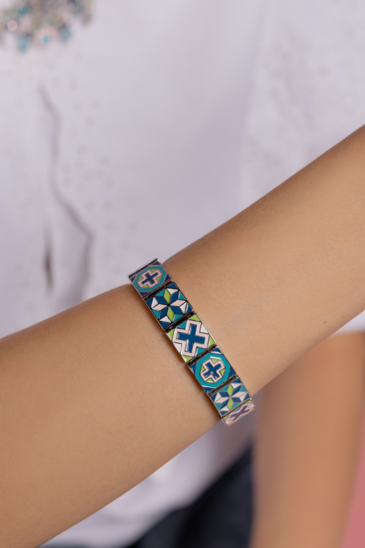 The Trenčín Ornaments bracelet, made of rhodium-plated brass and complemented with enamel, represents a mosaic fragment from the Trenčín region transformed into a contemporary, timeless piece of jewelry.