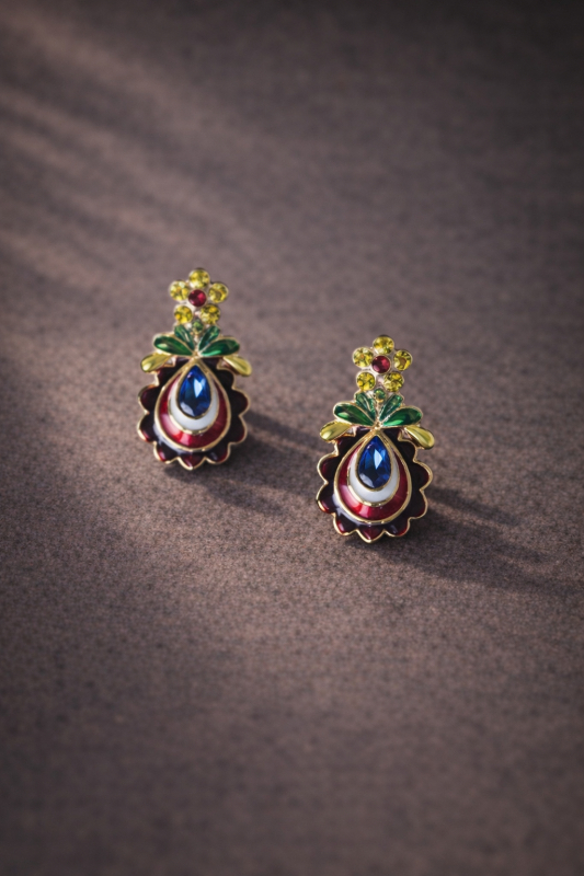 Recyklovaná pozlátená mosadz, časť v uchu chirurgická oceľ, český krištáľ, šperkársky emajl.