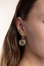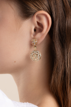 Náušnice Rovnováhy a lásky v zlatom pokovení s AB krištáľmi. Sú vyskladané z troch hlavných symbolov, ktoré majú najmä ochrannú funkciu a symbolizujú rovnováhu, ženstvo, lásku a harmóniu.