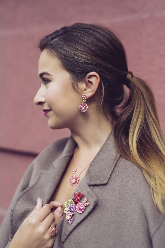 Pri tvorbe šperku sme sa inšpirovali nádhernou výšivkou na zásterkách kroja z Telgártu. Náušnice zachovávajú kompozíciu výšiviek, ale posúvajú ich do súčasnej nositeľnej formy. Kvety aj listy sú ručne tieňované českým krištáľom a maľované šperkárkym emajlom. Šperky z kolekcie Kvety Telgártu sú z pozlátenej mosadze ružovým zlatom a sú zatiaľ technologicky najzložitejšími aké sme kedy vytvorili.